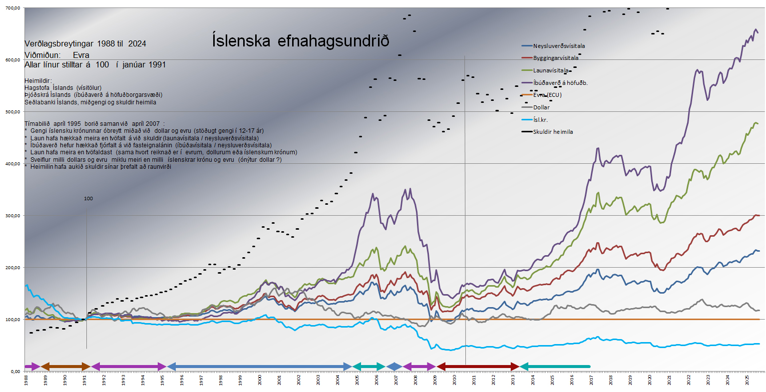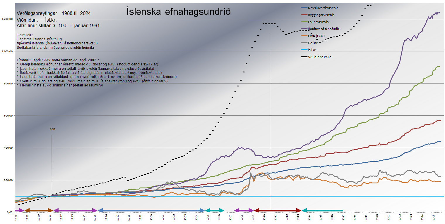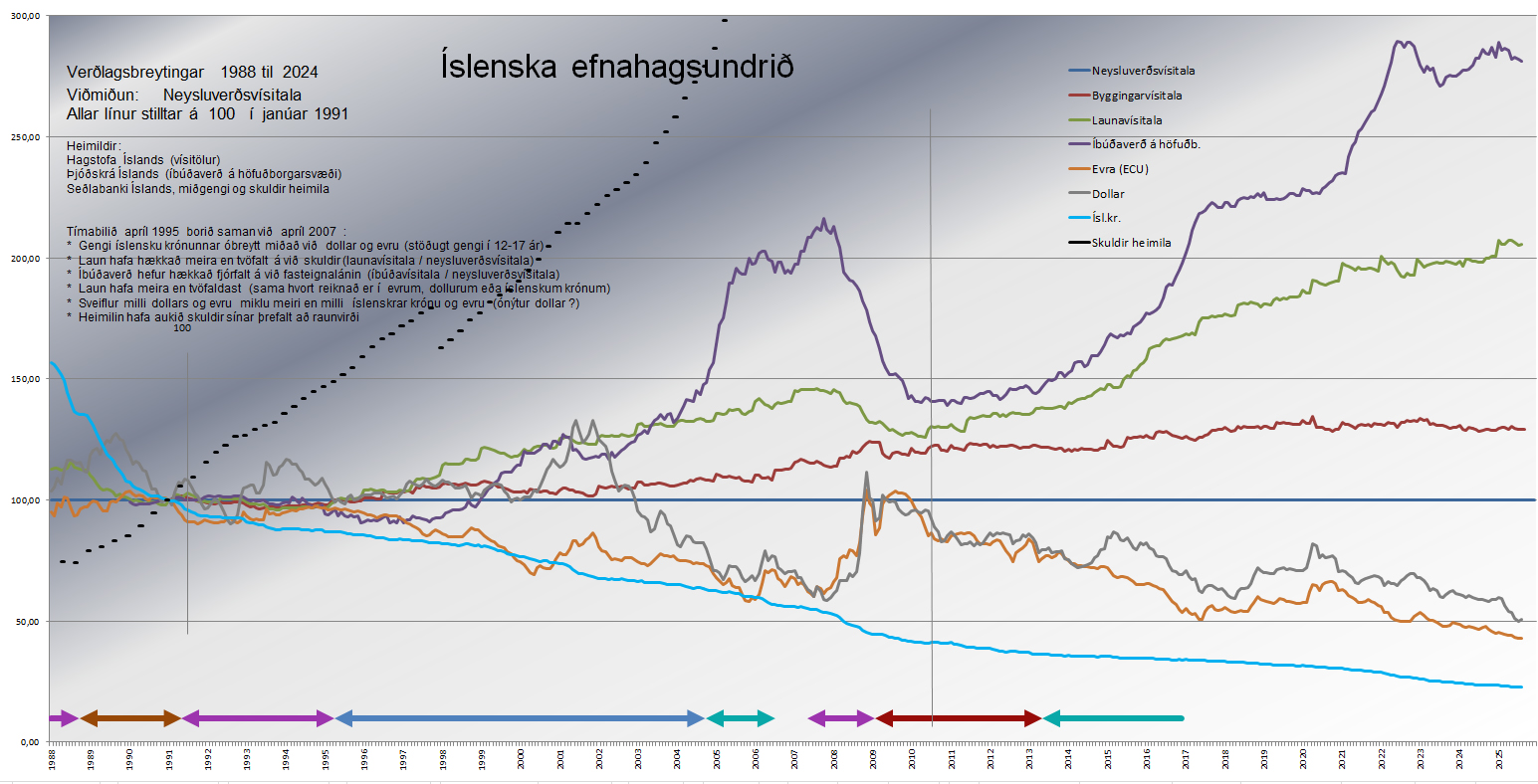 Launavísitalan, eða kaupmáttur launa sem stendur nú í 200 hefur því hækkað um 100% frá 1991. Fasteignaverð á höfuðborgarsvæðinu stendur í ca. 270 og hefur því hækkað um 170% umfram verðtryggðu lánin sem fylgja láréttu línunni. Verðmæti íslensku krónunnar hefur lækkað um ca. 75% á sama tíma. Verðmæti evru og dollars hafa lækkað um 50% og 40%. Þeir sem hafa tapað á verðtryggðu lánunum eru þeir sem keyptu húsnæði frá miðju ári 2004 til 2009 og misstu húsnæðið vegna bankahrunsins eða seldu á næstu árum á eftir. Skuldir heimilanna hafa hækkað um ca. 350% á sama tíma.